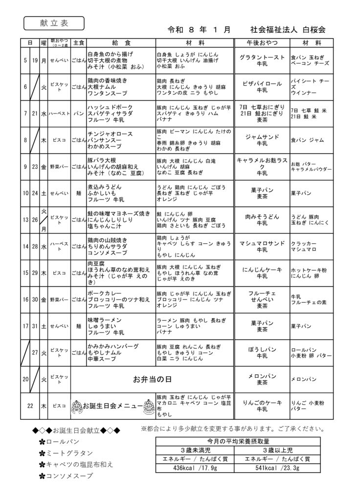 令和8年1月の献立表